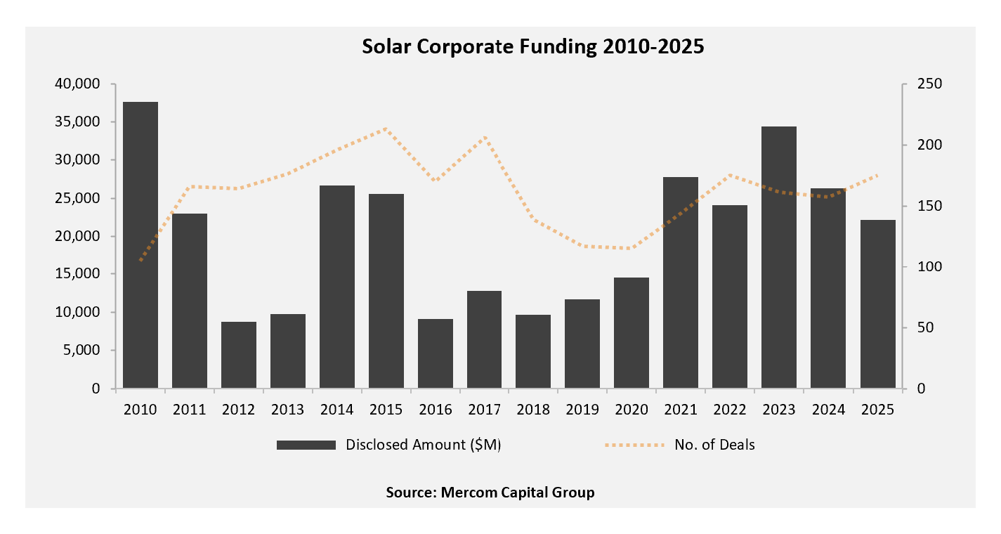 Total corporate funding, including venture capital (VC) funding, public market, and debt financing into the solar sector, decreased 16% year-over-year (YoY) in 2025, with $22.2 billion raised in 175 deals, compared to $26.3 billion in 157 deals in 2024.